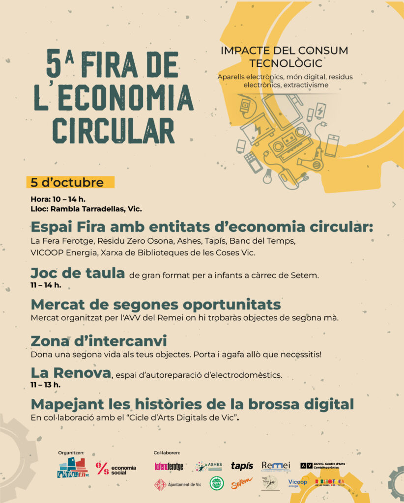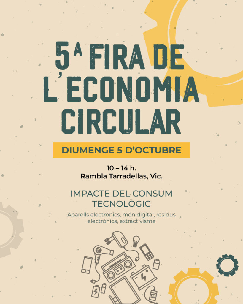 Ja s’acosta la 5a Fira d’Economia Circular de Vic! Aquest octubre parlem de tecnologia, impacte ambiental i alternatives col·lectives. La fira tindrà lloc el diumenge 5 octubre a la Rambla Tarradellas (Vic) de 10h a 14h.