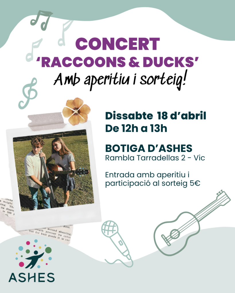 Us esperem el dissabte 18 d’abril, de 12h a 13h, amb un concert en acústic de Racoons & Ducks, que acompanyarem amb una mica d’aperitiu. I amb l’entrada de 5€ també entrareu en un sorteig!