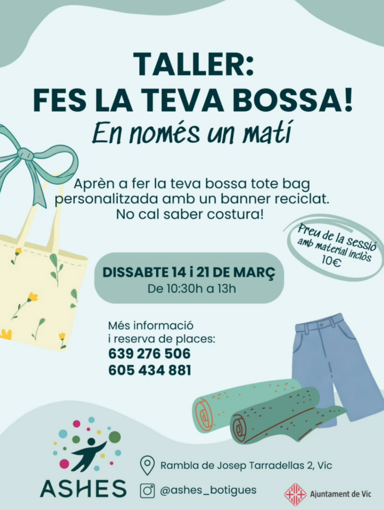 Els dissabtes 14 i 21 de març farem tallers per a ensenyar-vos com cosir a màquina una tote bag fent servir banners publicitaris reciclats.